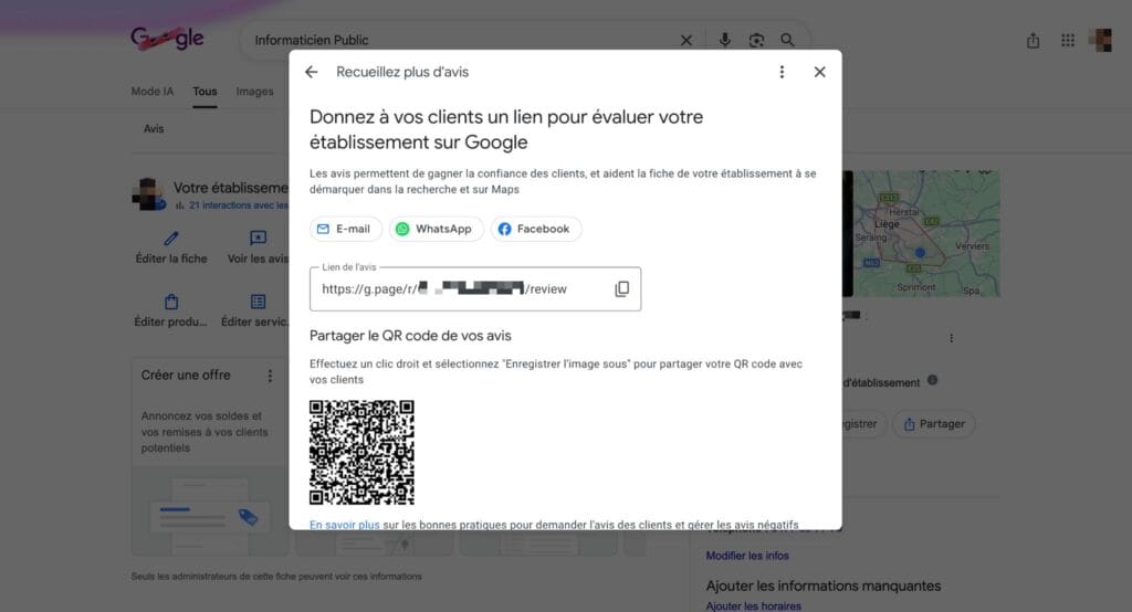 Cliquez sur “Demander des avis”. Google génère alors un lien officiel au format :
