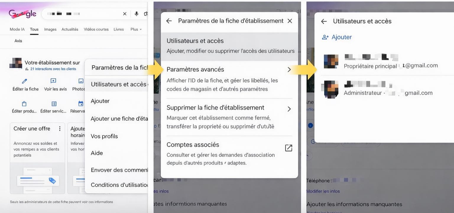 Connectez-vous à votre compte Google et recherchez votre établissement sur Google. Si vous êtes bien propriétaire ou administrateur, vous verrez apparaître le panneau de gestion de votre fiche.