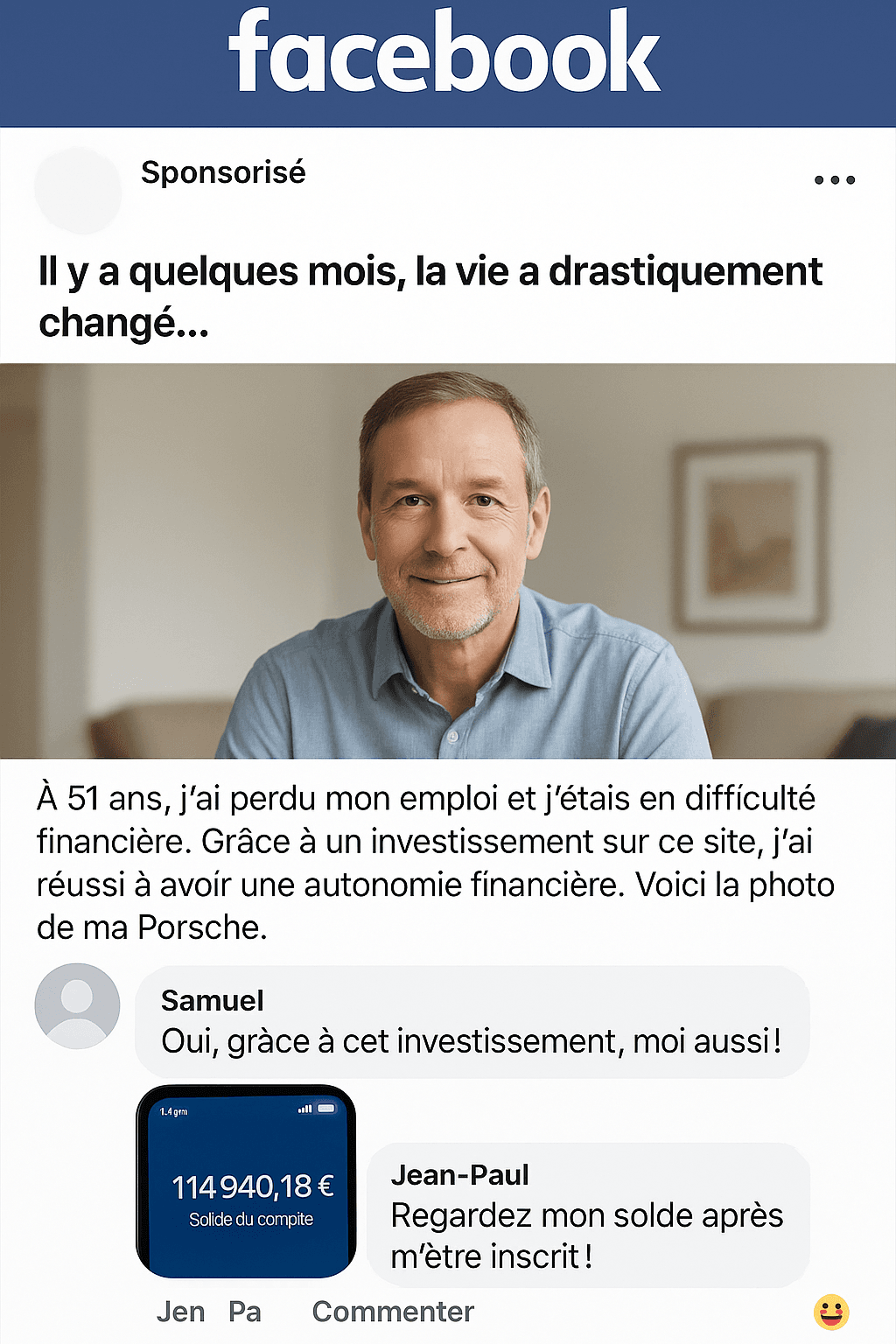 Le scénario est souvent identique : un homme d’une cinquantaine d’années raconte avoir perdu son emploi avant de “tout changer” grâce à un site d’investissement miracle. En quelques semaines, il conduit une Porsche et montre fièrement son compte en banque. Ces récits sont rédigés par des rédacteurs automatisés ou des escrocs utilisant des modèles de texte. Tout est calculé pour susciter la confiance et l’émotion.